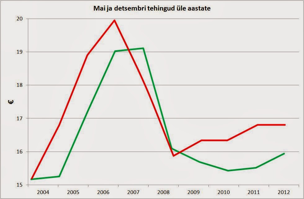 Selleks et aru saada, kas sesoonsuses on toimunud muutused, on vaja ette kujutada et langusaastatel on X telg mitte horisontaalne, vaid “langeb” koos majandusega. Lihtsaim meetod aru saada, kas sesoonsuses on muutusi või mitte on ühendada kahe järjestikuse aasta “keskmised” kuud omavahel sirgjoonega. Sama saab teha ka väga heade matemaatiliste mudelitega, aga põhimõtte illustreerimiseks kasutan lihtsat graafilist meetodit. Otsustasin, et mai kuu on kõige esinduslikum.