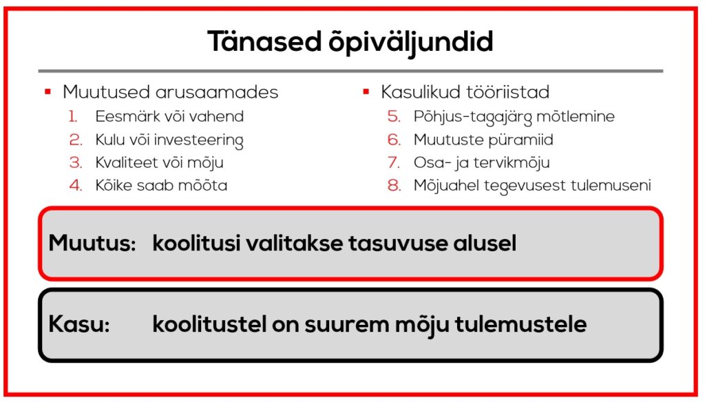 Aastal 2022 käisin ma Koolituskonverentsil esinemas teemal, kuidas koolituse mõju mõõta. Uurisin mõju mõõtmise praktikaid, hankisin endale isegi USA koolitusassotsiatsiooni vastava käsiraamatu, töötasin selle läbi, panin kokku lühiloengu „Koolitus – kulu või investeering?“, kus andsin tööriistad, kuidas mõõta koolituse tasuvust.