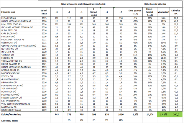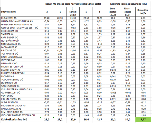 - Enne Kasvustrateegia Sprinti oli ettevõtete kogumi 3 aasta (2 ja 1 aastat enne Sprinti ning Sprindi aastal) keskmine kasum 26,2 Miljonit eurot.